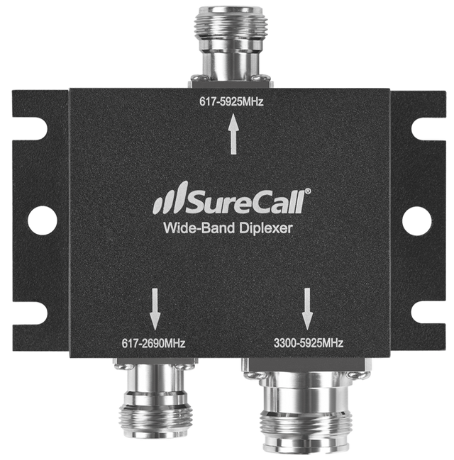 The SureCall 2-Way UWB Diplexer DC Bypass with 4.3-10 Female and N-Female allows you to manage two separate cellular frequency bands — one ranging from 617 to 2690 MHz and the other from 3300 to 5925 MHz — through a single coaxial line. It's a go-to solution when you're working on a system that needs to handle both LTE and 5G C-band signals without running extra cable.